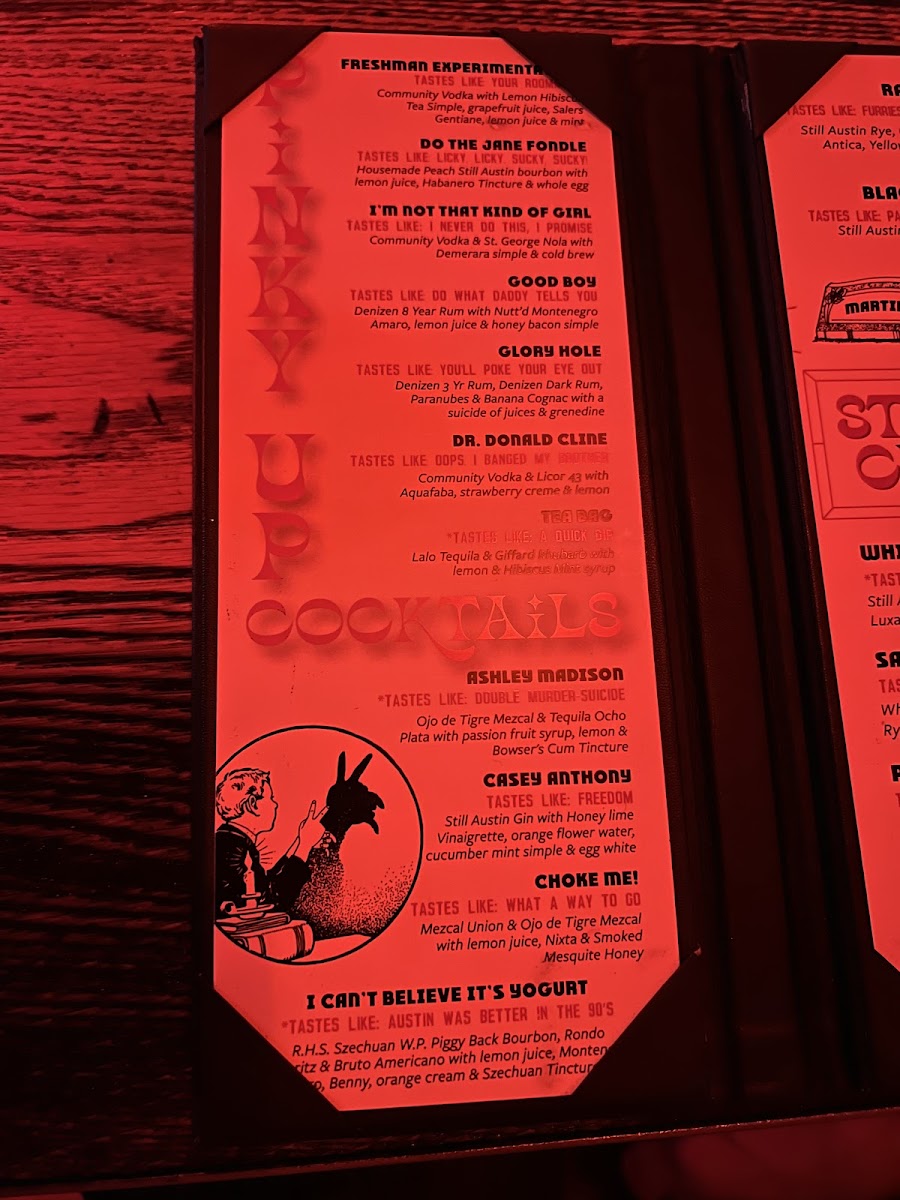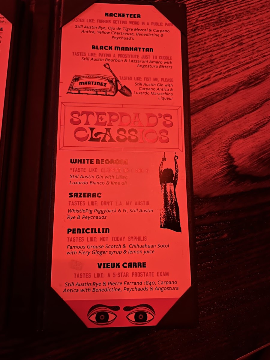 Floppy Disk Repair Co. offers a uniquely curated cocktail menu that pairs perfectly with its speakeasy, horror-themed atmosphere. The selection leans toward well-crafted, imaginative cocktails featuring spirited blends like bourbon, gin, and mezcal, complemented by inventive infusions and bitters. Alongside classic options such as the Manhattan and Sazerac, you’ll find playful, adventurous drinks like the “Life in San Antonio” and the “Pinky Up” series that invite exploration and conversation.